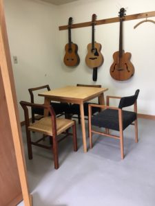 打ち合わせスペースにはみんなのギターやベースが並びます。